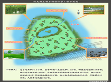 总占地面积56.1公顷,其中环湖心岛湿地带6.1公顷,种植湿地植物110万株;湖心岛内湖水面10公顷,内湖水体与外湖水体交换通道为2公里;湖心岛内湖湿地5公顷,种植湿地植物90万株;湖心岛鸟类栖息地25公顷,种植灌木15万株;天然草地恢复10公顷。